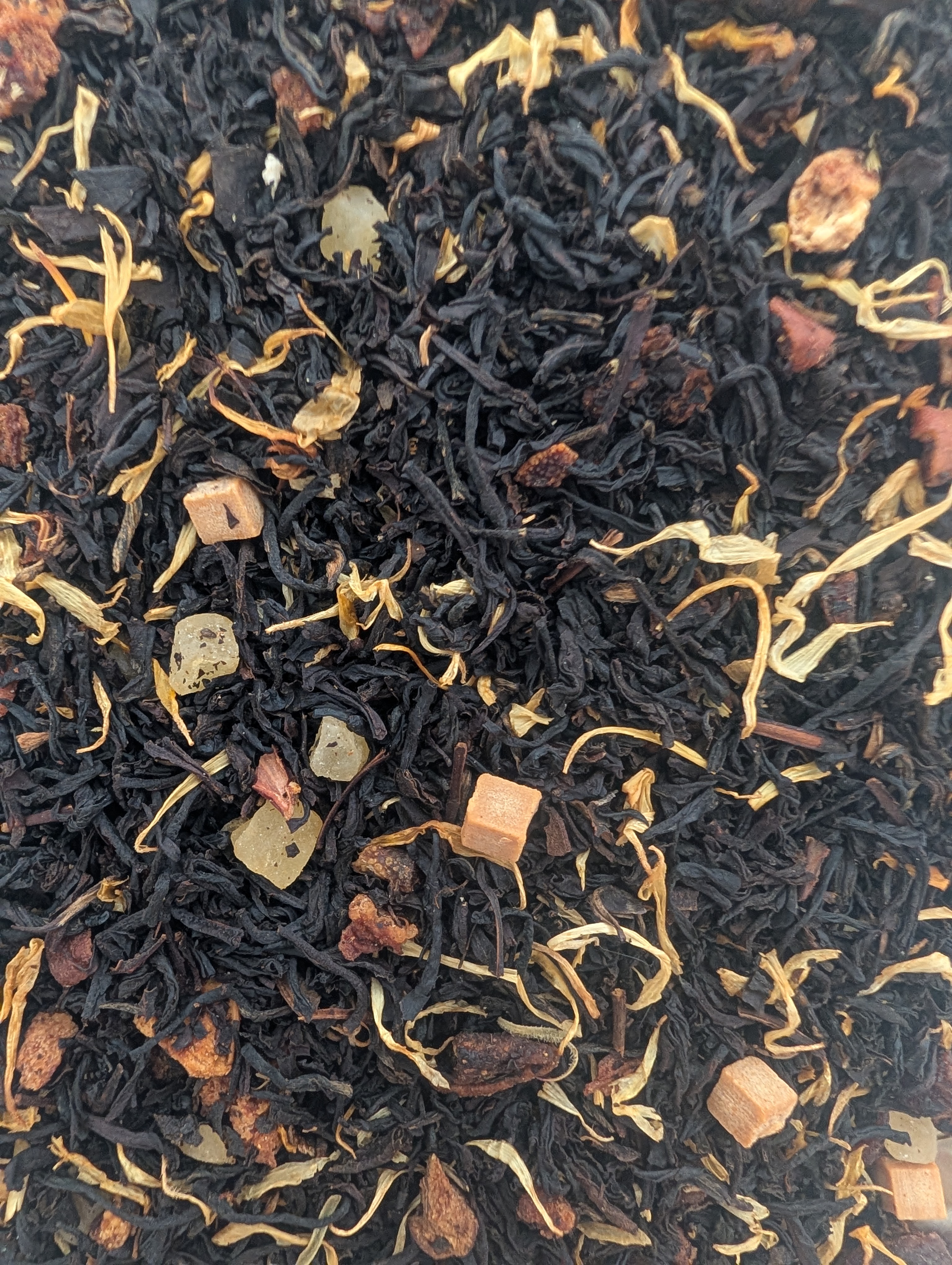 Diese exklusive Schwarzteemischung ist eine Hommage an klassische Dessertkunst, eingefangen in einer Tasse. Die Basis aus kräftigen Schwarztee bildet das Fundament für ein echtes Geschmackserlebnis: Saftige Birnenstücke und exotisch-süße kandierte Ananas verschmelzen mit dem Karamell. Die leuchtend gelbe Ringelblumenblüten sorgen nicht nur für eine edle Optik, sondern runden das Profil sanft ab.