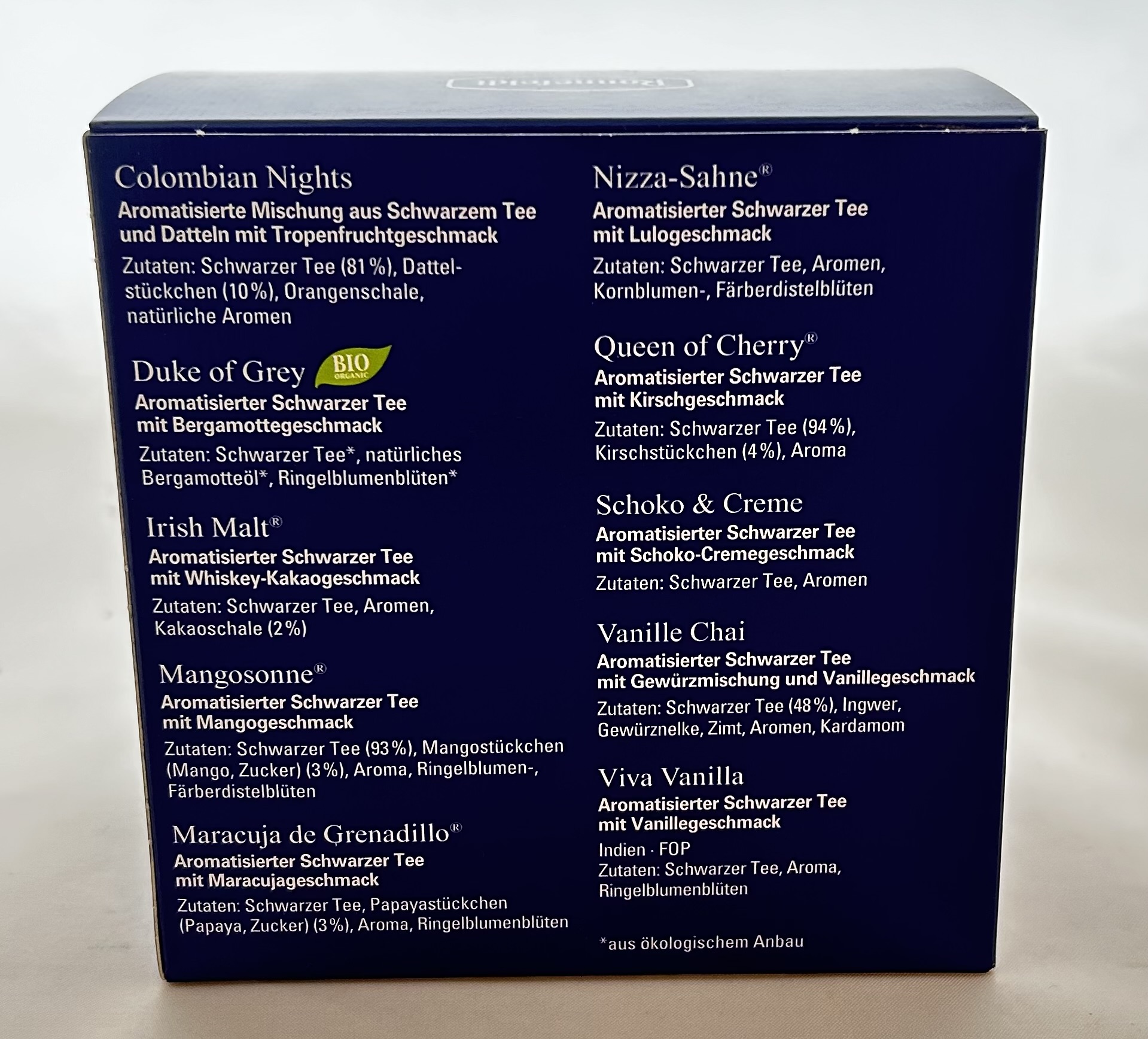 Probierbox mit 10 aromatisierten Schwarztee Sorten zum Kennenlernen.